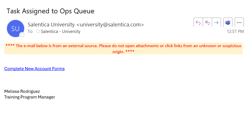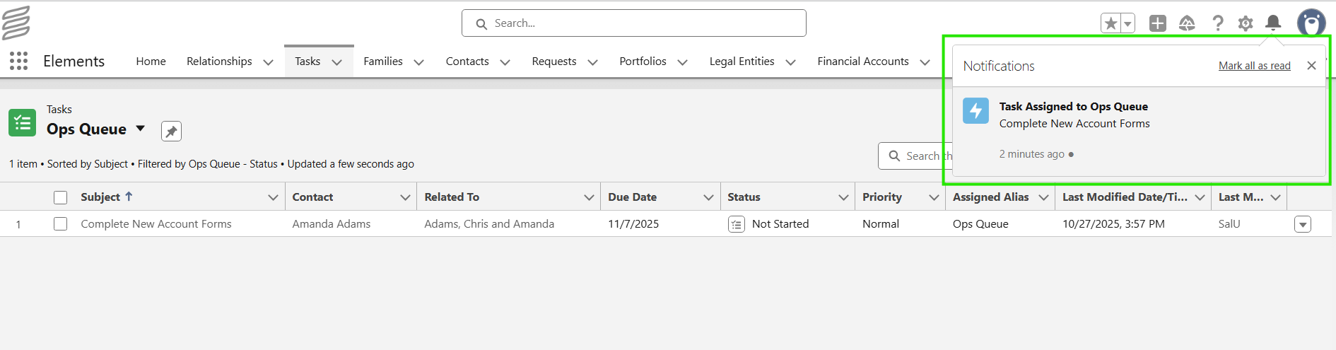 This example shows a Task assigned to an Operations Queue and an In-App alert to the assigned user. Click on the Task name in the notification to open the Task.