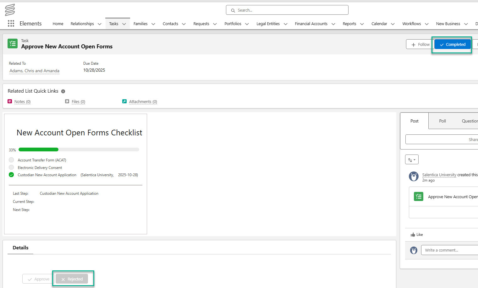 In this example, a Workflow contains a Task with both a Checklist and an Approval called "Approve New Account Open Forms." The Checklist is not complete, and the Task has been marked as Rejected, while the Task is also marked Completed. This allows the Workflow process to continue when the Checklist is incomplete and the Task needs to be marked Rejected.